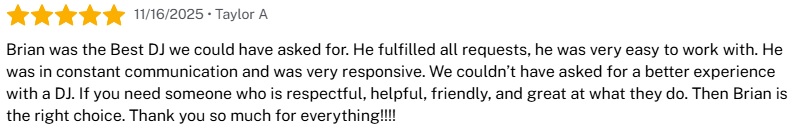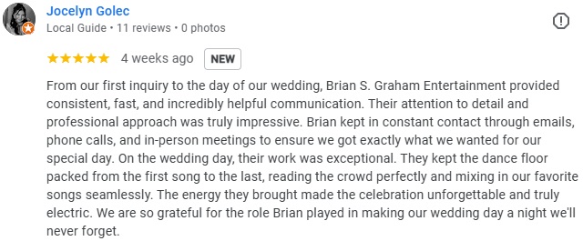 Additional testimonials can be found on Google, WeddingWire.com, and TheKnot.com.